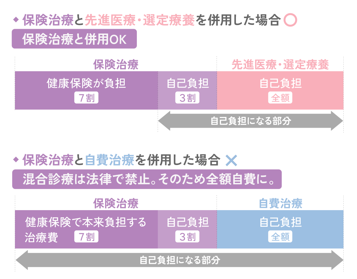 基本的に、保険治療と自費治療を併行して行う混合診療は法律で禁じられているのですが、厚生労働大臣が定める特定の医療技術の『先進医療』や『選定療養』は保険診療との併用が認められています。