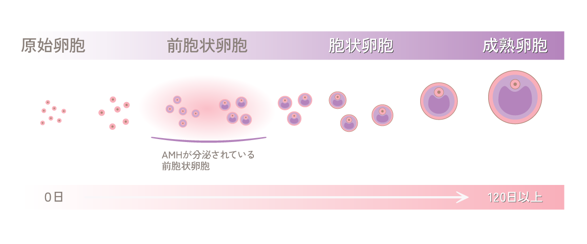 女性は、生まれつき200万個もの原子卵胞(卵子のおおもととなる細胞)を持って生まれてきます。原子卵胞は、生体活動を休止させた状態でストックされていますが、徐々に目覚め120日以上かけて卵子を排出(排卵)することのできる成熟卵胞にまで成長します。AMHを分泌する前胞状卵胞は、この成長の途中段階にある卵胞ですので、AMH値を測定することで、次周期以降に成長してくる成熟卵胞の数を予測することができるのです。